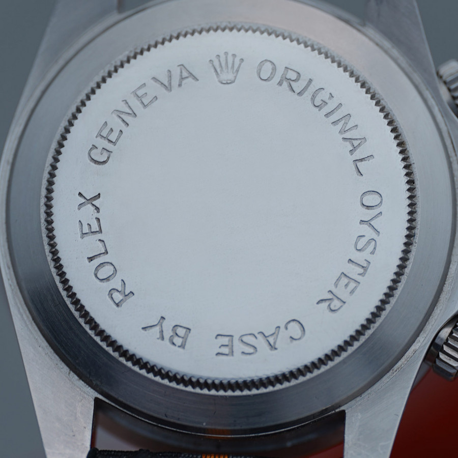 Die Rolex-signierte Krone und die Gravur "Original Oyster Case by Rolex Geneva" auf dem Gehäuseboden symbolisieren die enge Verbindung der beiden Marken in dieser Epoche und machen diesen Zeitmesser zu einem bedeutenden Stück Uhrengeschichte.