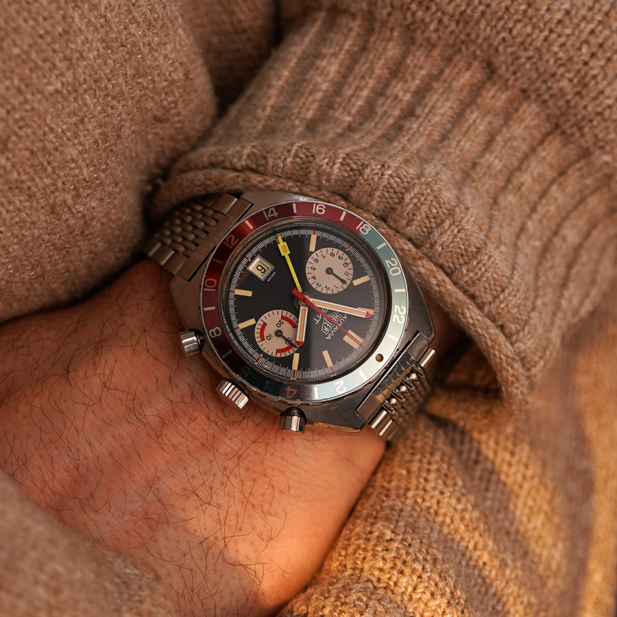 Hier präsentieren wir Ihnen eine der seltensten Autavias: die Heuer Autavia 741.603 GMT aus dem Jahr 1974 – die einzige Handaufzug-GMT, die in das markante Kissengehäuse der Referenz 1163 gekleidet wurde.