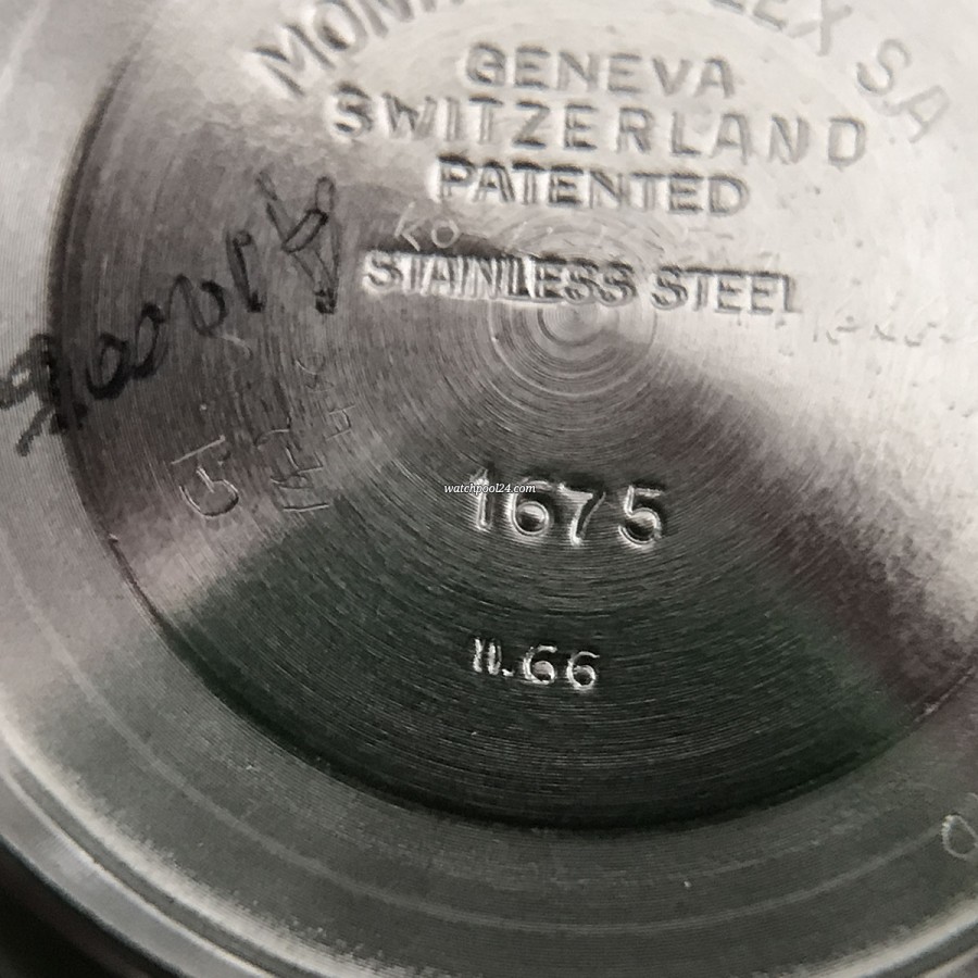 Here you see an early reference 1675 with a glossy gilt dial. This vintage watch dates from 1966 and is preserved in great condition despite its old age. The glossy dials always had gilt lettering, hence the nickname "gilt dial" or "gilt GMT". The later versions of reference 1675 had matte dials with white lettering. The gilt dial with its creamy tritium lume in the markers and hands creates a very warm look for this GMT Master. The black glossy surface of the dial is preserved with no spots or cracks with this particular vintage GMT.