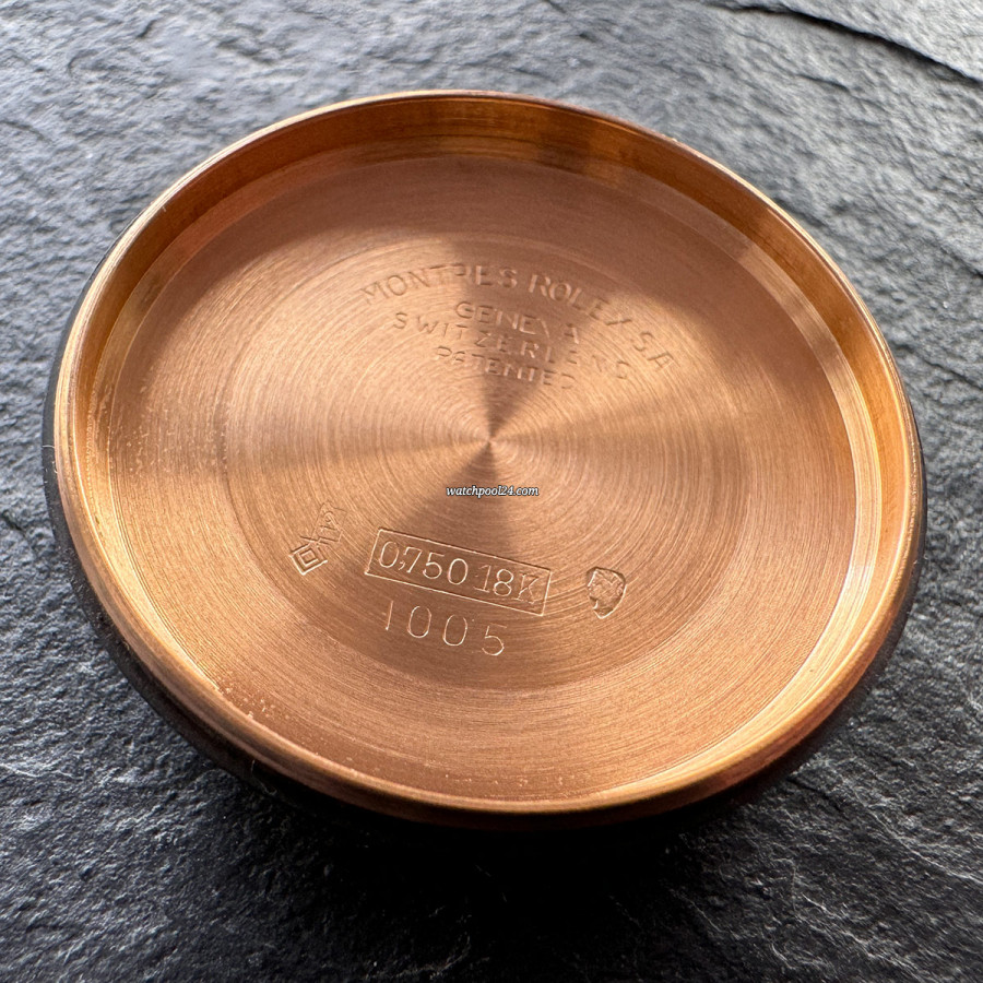 Case: 18K rose gold - sharp lugs - full profile - very slight signs of wear - smooth bezel - deep gold hallmarks - clearly legible numbers between the lugs - intact finish on the lugs.