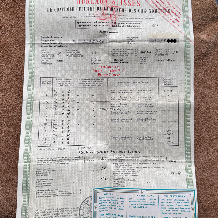 This Oyster Perpetual is even more valuable because of its original accessories. The movement number of the watch can be seen on the original watch rate certificate issued on 9 September 1965. The original Rolex chronometer guarantee shows the date of sale: 22 December 1968, and the old original Rolex box is also present.